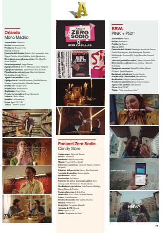 BBVAPINK + PS21Anunciante: BBVASector: FinanzasProducto: BancoMarca: BBVAContacto del cliente: Santiago Martín de Sousa, Paula Domínguez, Eva Rodríguez, Ricardo Maldonado, Lorena Gil, Jesús Becedas, Imanol RamosDirector general creativo / CEO: Germán SilvaDirectores creativos: Jesús Molina y Martín PolonskyEquipo de cuentas: Daniel Casillas, María Ortega y Lucía RamírezEquipo de estrategia: Sergio GarcíaProductora - Realizador: RebolucionRealizador: Felipe Gómez AparicioProductor ejecutivo: Ramón CorominasAgencia de medios: MindsharePieza: Spot TV 20”Título: “Hoy comienza todo”Fontarel Zero SodioCandy StoreAnunciante: Hijos de RiveraSector: FinanzasProducto: Bebida sin sodioMarca: Fontarel Zero SodioDirectores creativos: Gonzalo Figari, Cinthia DelgadoDirector del proyecto: Javier Boo FontenlaAgencia de medios: Havas MediaProductora: ZissouRealizador: Pol PenasDirector de arte y motion graphics: Kote García (AKA Berberecho Productions)Productores ejecutivos: Iván Franco Hidalgo, Marta Pérez de TudelaPostproducción: A.K.A. PostMontador: Xavi Trilla (Martes Studio)Color: Martí SomozaDiseño de sonido: The Lobby StudiosMúsica: ViMúsicaFotógrafo: Fernando MaselliAgencia de PR: BloodyPieza: Spot TV 30”Título: “Empezar de Zero”OrlandoMono MadridAnunciante: OrlandoSector: AlimentaciónProducto: Tomate fritoMarca: OrlandoContacto del cliente: Julieta De Laurentiis, Ana María Pombo, Alain Gabiña, Sofía CamberosDirectores generales creativos: Sito Morillo, Bitan FrancoDirector general: Jorge FesserEquipo creativo: David Manzano, Juan DelgadoEquipo de cuentas: Ainara Izar de la FuentePlanificación estratégica: Skip Ads (Adrián Mediavilla & Ledo Pérez)Agencia de medios: CaratEquipo Carat: David Esquinas, Natalia García, Marina García Garrido, Claudia SensatProductor: Chapi CalvoProductora: MatrimonioRealizador: Paul SteinProductor ejecutivo: Jorge MinguelaMúsica: Chaco MusicSonido: La PanaderíaPieza: Spot TV 1’20”Título: “Saber a sabor”79