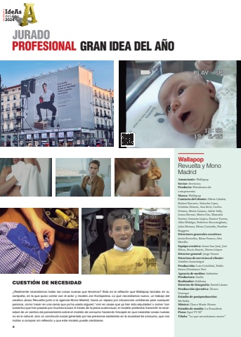8XXVIII AnunciosGRAN IDEA DEL AÑO nº 1727 28/04/2025 ideas del añoWallapopRevuelta y Mono MadridAnunciante: WallapopSector: ServiciosProducto: Plataforma de compraventaMarca: WallapopContacto del cliente: Olivia Calafat, Ruben Navarro, Natacha Cano, Cristina Gómez, Ana Seró, Carlos Gómez, Marta Lázaro, Adrià Valls, Joana Bernat, Marta Gui, Manuela Nerini, Germán López, Eunice Torres, Alba Hidalgo, Federico Roccatagliata, Julia Moisan, Elena Custodio, Pauline RoggeroDirectores generales creativos:Jesús Revuelta, Bitan Franco, Sito MorilloEquipo creativo: Irene San José, Javi Ribas, Rocío Barrio, Nieves LópezDirector general: Jorge FesserDirectora de servicios al cliente:Aitziber IzurrateguiProducción: Luis Cristóbal, Pablo Senra (Freelance For)Agencia de medios: InitiativeProductora: GarlicRealizador: OckhamDirector de fotografía: David LázaroProducción ejecutiva: Álvaro GorospeEstudio de postproducción:McNultyMúsica: Chaco Music HouseEstudio de sonido: La PanaderíaPieza: Spot TV 50”Título: “Lo que necesitamos nuevo”CUESTIÓN DE NECESIDAD ¿Realmente necesitamos todas las cosas nuevas que tenemos? Esta es la reflexión que Wallapop lanzaba en su campaña, en la que quiso contar con el actor y modelo Jon Kortajarena. Lo que necesitamos nuevo, un trabajo del creativo Jesús Revuelta junto a la agencia Mono Madrid, hacía un repaso por situaciones cotidianas para cualquier persona, como ‘nacer en una cama que ya ha usado alguien’, ‘vivir en casas que ya han sido alquiladas’ o comer ‘con cubiertos que han pasado por muchas bocas’. A través de la pieza audiovisual, el modelo pretendía transmitir la necesidad de un cambio de pensamiento sobre el modelo de consumo haciendo hincapié en que necesitar cosas nuevas no es lo natural, sino un constructo social generado por las presiones existentes en la sociedad de consumo, que nos incitan a comprar sin reflexión y que este modelo puede cambiarse.19