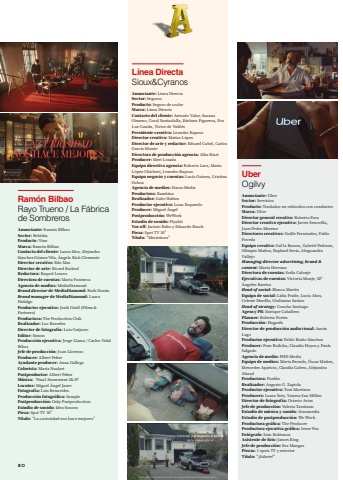 Ramón BilbaoRayo Trueno / La Fábrica de SombrerosAnunciante: Ramón BilbaoSector: BebidasProducto: VinoMarca: Ramón BilbaoContacto del cliente: Laura Mur, Alejandro Sánchez-Gómez Vila, Ángela Rich ClementeDirector creativo: Edu MasDirector de arte: Ricard BarbodRedactora: Raquel LoscosDirectora de cuentas: Marta FontsecaAgencia de medios: MediaDiamondBrand director de MediaDiamond: Ruth DuránBrand manager de MediaDiamond: Laura HidalgoProductor ejecutivo: Jordi Güell (Films & Partners)Productora: The Production ClubRealizador: Luc KnowlesDirector de fotografía: Luis GuijarroEditor: SimonProducción ejecutiva: Jorge Llama / Carlos Vidal RibasJefe de producción: Joan LloverasProducer: Albert PekerAyudante producer: Anna GallegoColorista: Maria NualartPostproductor: Albert PekerMúsica: ‘Final Atonement 2&39’Locutor: Miguel Ángel JanerFotografía: Laia BenavidesProducción fotográfica: SamplePostproducción: Only PostproductionEstudio de sonido: Idea SonoraPieza: Spot TV 30”Título: “La curiosidad nos hace mejores”Línea DirectaSioux&CyranosAnunciante: Línea DirectaSector: SegurosProducto: Seguro de cocheMarca: Línea DirectaContacto del cliente: Antonio Valor, Susana Gimeno, Coral Santaolalla, Bárbara Figueroa, Eva Luz Cuntín, Victor de ValdésPresidente creativo: Leandro RaposoDirector creativo: Matías LópezDirector de arte y redactor: Eduard Cubel, Carlos García-MunteDirectora de producción agencia: Alba RiartProducer: Meri LosadaEquipo directivo agencia: Roberto Lara, María López-Chicheri, Leandro RaposoEquipo negocio y cuentas: Lucía Guinea, Cristina OchoaAgencia de medios: Havas MediaProductora: BambinaRealizador: Gabe IbáñezProductor ejecutivo: Luna EsquerdoProducer: Miguel ÁngelPostproducción: WeWorkEstudio de sonido: FlyabitVoz off: Jacinto Bobo y Eduardo BoschPieza: Spot TV 30”Título: “Mecánicos”UberOgilvyAnunciante: UberSector: ServiciosProducto: Traslados en vehículos con conductorMarca: UberDirector general creativo: Roberto FaraDirector creativo ejecutivo: Javier Senovilla, Juan Pedro MorenoDirectores creativos: Guille Fernández, Pablo PovedaEquipo creativo: Gal·la Basora, Gabriel Pedrozo, Olimpia Muñoz, Raphael Soria, Aleguandra VallejoManaging director advertising, brand & content: María HerranzDirectora de cuentas: Sofía CalonjeEjecutivas de cuentas: Victoria Monje, Mª Ángeles BarriosHead of social: Blanca MartínEquipo de social: Lidia Fraile, Lucía Abos, Celeste Murillo, Giulianna SantosHead of strategy: Concha SantiagoAgency PR: Enrique CaballeroPlanner: Roberta FortesProducción: HogarthDirector de producción audiovisual: Aarón LagoProductor ejecutivo: Pablo Riaño SánchezProducer: Fran Ruiloba, Claudia Hoyos y Paula SalgadoAgencia de medio: PHD MediaEquipo de medios: Marta Brondo, Óscar Mañez, Mercedes Aparicio, Claudia Calero, Alejandra AhaudProductora: PuebloRealizador: Augusto G. ZapiolaProductor ejecutivo: Toni MartínezProducers: Laura Soto, Vanesa San MillánDirector de fotografía: Octavio AriasJefe de producción: Valeria TarsitanoEstudio de música y sonido: SonomediaEstudio de postproducción: We WorkProductora gráfica: The ProducerProductora ejecutiva gráfica: Irene PazFotógrafo: Sam RobinsonAsistente de foto: James KingJefe de producción: Eva MangasPiezas: 3 spots TV y exteriorTítulo: “¡Súbete!”80