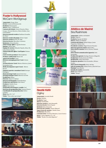 Foster’s HollywoodMcCann WorldgroupAnunciante: Grupo AlseaSector: Comercio/RestauraciónProducto: RestaurantesMarca: Foster’s HollywoodContacto del cliente: Alexis Chauvin, Elena Campo, Victoria Montoro, Marta Solabre, Sara ComendadorDirector general creativo: Emiliano González De PietriDirector creativo de grupo: Álvaro LópezDirector creativo: Javier de VegaDirector de arte: Marcelino ContrerasRedactora: Alicia SánchezChief strategy officer: Agustín SorianoPlanner: Álvaro DiezEquipo de cuentas: Eduardo Pajuelo, Mery Gil, Celia Gómez-AnguloChief production officer Craft Spain: Paloma AdrienLead executive producer: María IglesiasProducer audiovisual: Marta CidAgencia de medios: CaratBusiness managing partner Carat: Atenea PérezAccount director Carat: Mónica Palacios y Javier Fernández-LunaMedia development expert Carat: Alberto BernalChannel expertise consultant Carat: Enrique RodríguezHead of stategy Carat: Javier de la CruzStrategy manager Carat: Marcela AcevedoProductora: ZissouDirector: Mauri D. GalianoDirector de fotografía: Daniel BorbujoProductores ejecutivos: Iván FrancoProducer: Natalia PurasEditor: Fran GarcíaPostproducción Imagen y sonido: CrafDirectora de postproducción: Vanessa PizarroCoordinador de postproducción: Esther CeballosPieza: Spot TV 1’15”Título: “Puro sabor que atrapa”Nestlé KéfirOgilvyAnunciante: Lactalis NestléSector: BebidasProducto: YogurMarca: Nestlé KéfirDirector creativo: Jofre BanquellsDirector de arte: Boris PuyanaRedactor: Ricard JuanolaDirectora de cuentas: Vanesa MayoralSupervisora de cuentas: Natalia LlanaProductora: Black BoxComunicación: Christian Martínez, Laura CuencaPieza: 3 spots digitales 15” y 10”Título: “Ayuda a tu salud digestiva”Atlético de MadridSra.RushmoreAnunciante: Atlético de MadridSector: DeporteProducto: Equipo de fútbolMarca: Atlético de MadridContacto del cliente: Rafael Alique, Javier Vaquerizo, Valerio GoriPresidente creativo: Miguel García VizcaínoDirectora general creativa: Marta RicoDirección de cuentas: Rocío Cáceres, Yolanda SantiagoDirección de comunicación (agencia): Inés FernándezProducción agencia: Santiago Romero (Hogarth)Productora: Producciones Lee FilmsRealización: Anita García RicoProductor ejecutivo: Iván Fernández, Alfonso CuadraDirección de fotografía: Pedro del ReyJefes de producción: Adrián Ferrer, Julia Del CuraMontaje: Luna MartínEstudio de sonido: SonomediaPieza: Spot online 2’Título: “Monja”89