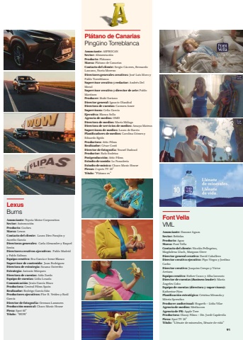 Font VellaVMLAnunciante: Danone AguasSector: BebidasProducto: AguaMarca: Font VellaContacto del cliente: Nicolás Pellegrino, Magdalena Lluch, Margaux GivreDirector general creativo: David CaballeroDirector creativo ejecutivo: Pipo Virgos y Jordina CarboDirector creativo: Joaquim Crespo y Víctor ArriazuEquipo creativo: Esther Cusco y Alba lavoratoDirector de cuentas (Business leader): María Ángeles CoboEquipo de cuentas (directora y supervisora):Katherine PáezPlanificación estratégica: Cristina Miranda y Mireia SpreaficoProducer audiovisual: Hogarth – Lidia VilarAgencia de medios: MediacomAgencia de PR: Apple TreeProductora: Glassy Films – Dir. Jordi CapdevilaPieza: Spot TV 20”Título: “Llénate de minerales, llénate de vida”Plátano de CanariasPingüino TorreblancaAnunciante: ASPROCANSector: AlimentaciónProducto: PlátanosMarca: Plátano de CanariasContacto del cliente: Sergio Cáceres, Bernardo Lazcano, Nuria MorenoDirectores generales creativos: José Luis Moro y Pablo TorreblancaSupervisor creativo y redactor: Andrés Del MoralSupervisor creativo y director de arte: Pablo MartínezProducer: Iñaki SorianoDirector general: Ignacio OlazábalDirectora de cuentas: Carmen AmerSupervisora: Celia GarcíaEjecutiva: Blanca SollaAgencia de medios: OMDDirectora de medios: María MálagaDirectora de servicios de medios: Amaya MateusSupervisora de medios: Laura de BarrioPlanificadores de medios: Carolina Gómez y Eduardo EgidoProductora: Attic FilmsRealizador: César ContiDirector de fotografía: Yousef DadoudProductor: Rafa EndeizaPostproducción: Attic FilmsEstudio de sonido: La PanaderíaEstudio de música: Chaco Music HousePiezas: 2 spots TV 20”Título: “Plátano es”LexusBurnsAnunciante: Toyota Motor CorporationSector: AutomociónProducto: CochesMarca: LexusContacto del cliente: Laura Díez Parajón y Aurelio GarcíaDirectoras generales: Carla Alexander y Raquel SerónDirectores creativos ejecutivos: Pablo Madrid y Pablo SalinasEquipo creativo: Eva García e Irene BlancoSupervisor de contenido: Juan RodríguezDirectora de estrategia: Susana OuteriñoEstrategia: Antonio MárquezDirectora de cuentas: Aída ZurdoEquipo de cuentas: Lidia LosadaComunicación: Jesús García RiscoProductora: Central Films SpainRealizador: Rodrigo García SáizProductores ejecutivos: Flor R. Veidez y Raúl GarcíaDirector de fotografía: German LammersProducción musical: Chaco Music HousePieza: Spot 40”Título: ‘WOW’91