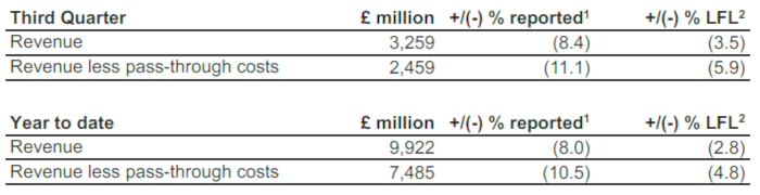 El grupo WPP ha informado sobre una caída del 8,4% en sus ingresos del tercer trimestre (3.748 millones de euros), lo que supone una disminución del 3,5% en términos like-for-like. Por su parte, sus ingresos netos de costes de traspaso se situaron en 2.828 millones de euros, con una caída del 11,1% en términos reportados y del 5,9% LFL. Entre los meses de enero y septiembre, el holding británico ha generado 11.410 millones de euros en ingresos, un 8% menos que en el mismo periodo de 2024, mientras que los ingresos menos costes de traspaso cayeron un 10,5% reportado y un 4,8% en términos orgánicos, hasta los 8.608 millones de euros.