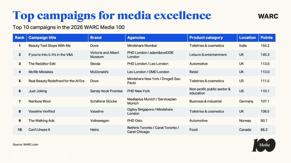 Amy Rodgers, directora de contenidos de Warc Creative, destaca sobre esta edición del ranking que “la rápida evolución del panorama mediático impulsada por la tecnología, los cambios en el comportamiento de los consumidores y las nuevas plataformas está transformando la forma en que las marcas y sus agencias asociadas interactúan con el público de manera significativa e impactante. El informe ‘Media 100’ celebra las campañas y empresas más premiadas que están a la vanguardia de estos cambios y servirá de inspiración y generará nuevas oportunidades para el sector”.