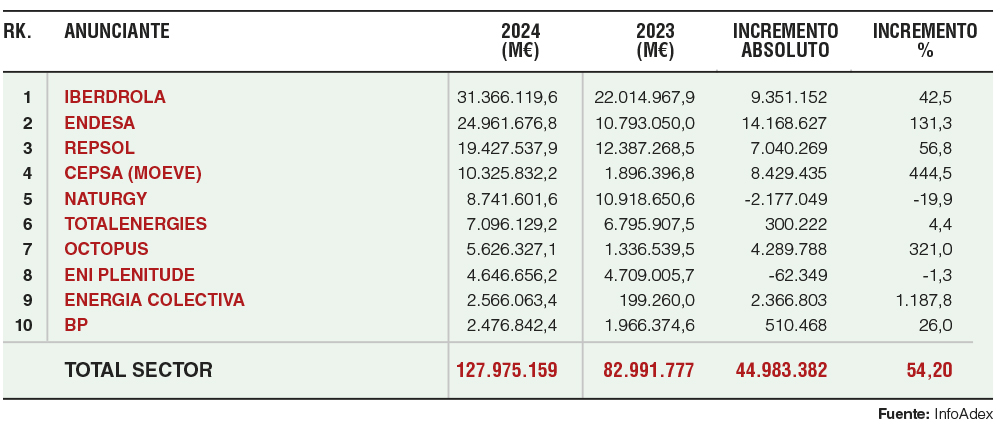 Con casi 128 millones de euros, el sector de la Energía protagonizó el mayor incremento de inversión publicitaria, concretamente un 54,20%, de acuerdo con los datos de InfoAdex facilitados a Anuncios.