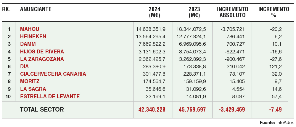 En paralelo, la inversión publicitaria del sector cervecero durante 2024 muestra una fotografía marcada por la estabilidad, tanto en cifras como en los actores implicados. Según datos de InfoAdex, el sector invirtió 42,34 millones de euros, frente a los 45,77 millones de 2023. La diferencia supone una ligera caída del 7,49%. Una de las señales más claras de esta estabilidad es que el ranking de principales anunciantes apenas varía. Los nombres son prácticamente los mismos que en 2023.