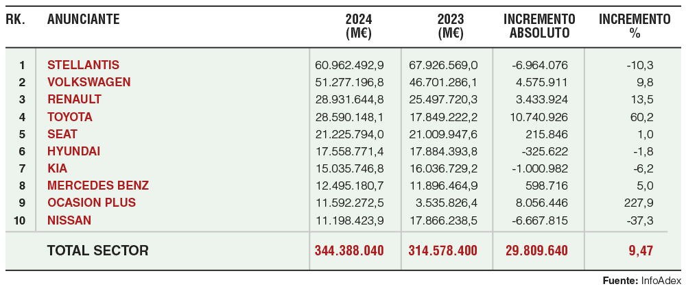 El signo positivo es, sin lugar a duda, protagonista de la tabla. Además de Stellantis, los únicos ejemplos negativos que encontramos son los de Hyundai (-1,8%), Kia (-6,2%) y Nissan, compañía esta última que registró la mayor merma porcentual de la inversión: -37,3%.