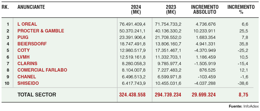 Las dos primeras posiciones de la tabla de mayores anunciantes del sector están ocupadas, como lleva ocurriendo los últimos años, por L’Oréal y Procter & Gamble, que mantuvieron sus puestos. L'Orèal, entre cuyas marcas se encuentran Maybelline, Garnier y L'Orèal París, en la gama media; y Lancòme, Cacharel y Giorgio Armani, en la alta, con un presupuesto de algo más de 76 millones de euros, fue el primer anunciante del país en 2024 e invirtió en medios 26 millones más que el segundo incrementando su partida un 6,6%. De hecho, las diferencias de gasto en la parte alta de la tabla son muy notorias (entre el primer clasificado y el tercero hay una distancia de 53 millones de euros, aunque según desciende la clasificación, las distancias se acortan).