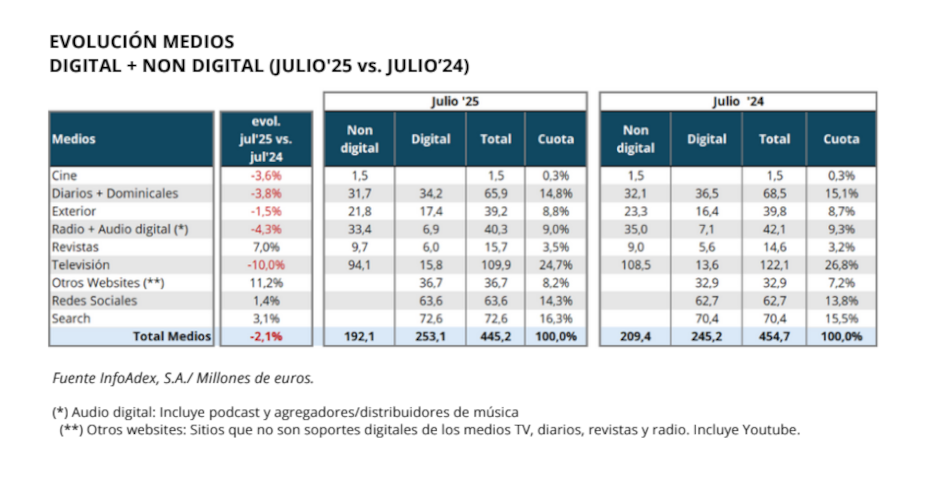 Durante el mes de julio, la inversión publicitaria ha alcanzado los 445,2 millones de euros, un 2,1% por debajo del periodo equivalente de 2024, cuando el volumen registrado fue de 454,7 millones de euros.