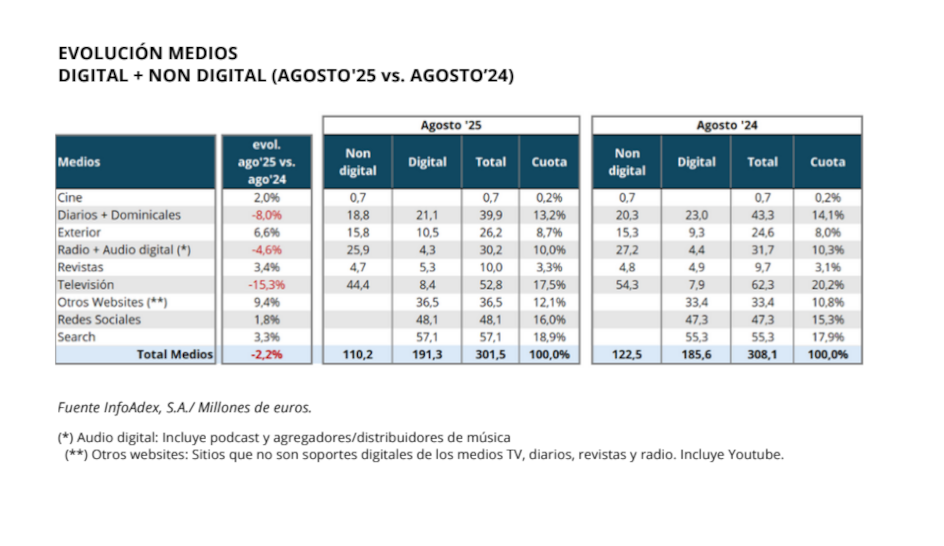 La radio, por su parte, registró una segunda caída consecutiva: se redujo un 4,6% su montante respecto a agosto de 2024, con una cifra de 30,2 millones de euros.