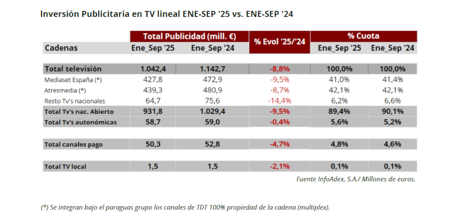 Tomando como referencia el cómputo total de las partidas destinadas tanto a publicidad convencional como digital, la televisión ocupa la primera posición por volumen de inversión, con 1.204,7 millones de euros en los primeros nueve meses del año, aunque ello supone una disminución del 6% respecto al mismo periodo de 2024.