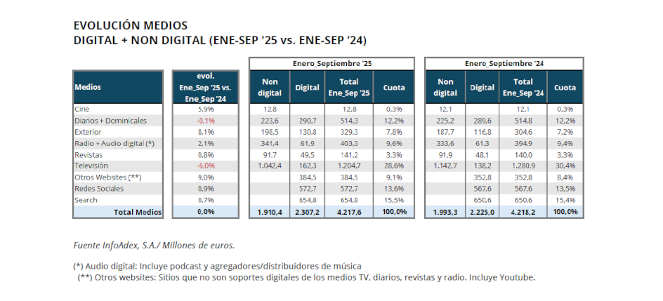 Los datos de InfoAdex respecto a los nueve primeros meses del año reflejan una evolución plana en este periodo, con una cifra de 4.217,6 millones de euros, prácticamente estable respecto a la de los nueve primeros meses de 2024, que fue de 4.218,2 millones, lo que arroja un crecimiento cero interanual.
