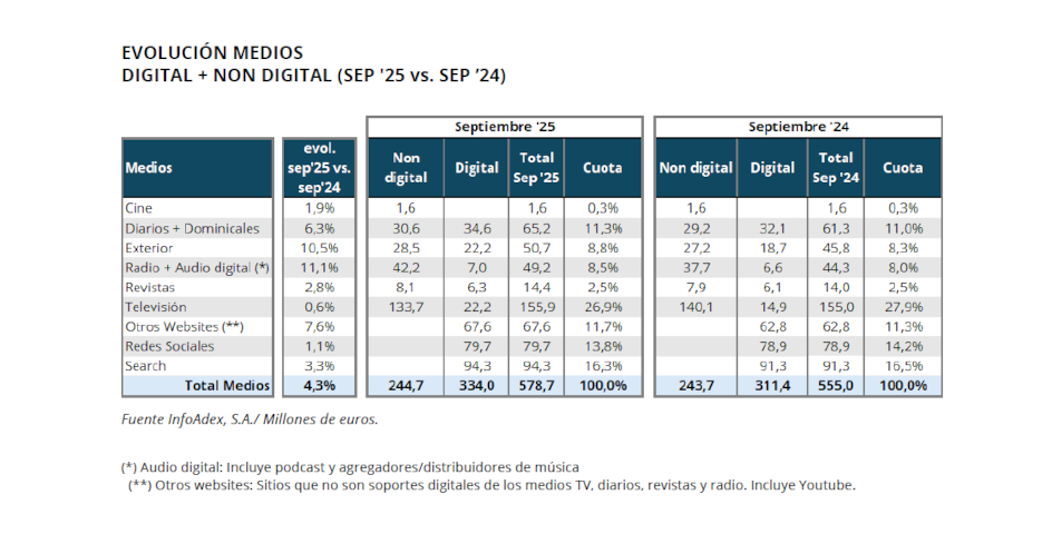 Por otra parte, los datos relativos al mes de septiembre arrojan buenas noticias después de los datos de julio y agosto en los que se produjo un recorte. Así, InfoAdex cifra en 578,7 millones de euros lo invertido en el conjunto de los medios, tanto en publicidad convencional como digital, lo que supone un incremento del 4,3% sobre la cifra en septiembre de 2024.