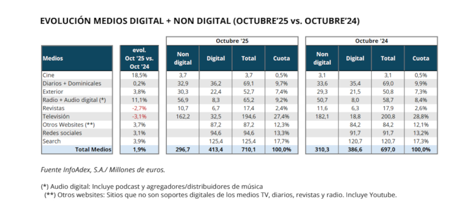Destaca el comportamiento de la inversión dirigida a televisión. Aunque sigue en números rojos, el recorte en octubre ha sido del 3,1%, lo que supone una mejora notable respecto al 8,8% que había perdido en septiembre respecto al año anterior. La televisión ocupa la primera posición por volumen de inversión publicitaria, con una cifra de 194,6 millones de euros recaudados en octubre. En segundo lugar, la publicidad dirigida a buscadores alcanza los 125,4 millones de euros, un 3,9% por encima de la registrada en octubre de 2024. Redes sociales ocupa la tercera posición, con una cifra de 94,6 millones de euros, un 3,1% por encima de la cifra del año anterior. Diarios y dominicales aparece en cuarto lugar por volumen de inversión, manteniéndose en el entorno de los 69,1 millones de euros. Radio y audio digital registra un notable crecimiento, en concreto del 11,1%, con una cifra de 65,2 millones de euros. La partida destinada a otros websites se ha elevado a 87,2 millones, lo que supone un crecimiento del 3,7%, incremento similar al experimentado por exterior (3,8%), que alcanza una cifra de 52,7 millones de euros ingresados por publicidad en octubre. Otro repunte importante ha sido el del cine, que ha ingresado un 18,5% más que en el mismo mes del año anterior, lo que arroja una cifra de 3,7 millones de euros. Por el contrario, la inversión dirigida a revistas ha caído un 2,7% en este mes, situándose en 17,4 millones de euros.