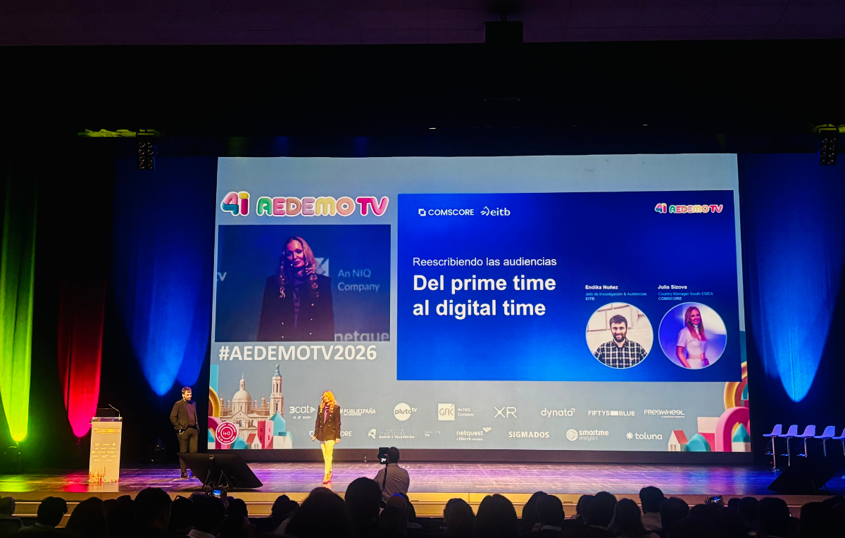 Julia Sizova, country manager South EMEA de Comscore, y Endika Núñez , jefe de investigación y audiencias de EITB, compartieron escenario. La primera hizo una radiografía del actual entorno audiovisual, marcado por la hiperfragmentación del consumo, el avance de la inteligencia artificial y una creciente competencia global, a lo que se suman marcos regulatorios europeos cada vez más exigentes. Este contexto, explicó, está obligando a los medios a replantear sus estrategias, especialmente en lo que respecta a la distribución de contenidos y su medición.