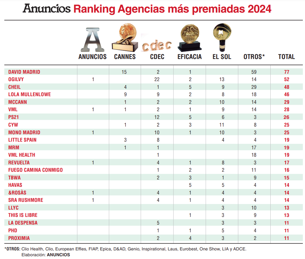 De este modo, WPP encabeza en 2024 el ranking de agencias más premiadas. A David, que ha liderado esta clasificación también en los dos años anteriores, y que sigue ocupando el primer puesto en el último recuento anual con un total de 77 premios obtenidos en alguno de los más de veinte certámenes analizados para elaborar este ranking, se le ha unido, en segunda posición, Ogilvy. Esta agencia, que en 2023 figuraba en cuarto lugar de la tabla por número de reconocimientos, se ha situado en 2024 en el segundo puesto tras sumar un total de 52 galardones.