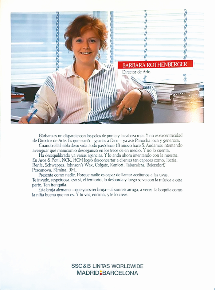 De origen alemán, antes de llegar a Lintas, Bárbara había pasado a principios de los Setenta por agencias como Arce & Potti y NCK, habiendo sido en ambas pareja creativa del gran Manolo Valmorisco. En una hoja suelta, que posiblemente formara parte de algún anuario o documento promocional de la agencia, y que está conservada en el archivo personal de Mari Tere (que su hija Maite puso a nuestra disposición), se la describe irónicamente así: “Bárbara es un disparate. Con los pelos de punta y la cabeza roja. Y no es excentricidad de director de arte. Es que nació -gracias a Dios- ya así: panocha, loca y generosa.” Y se añade: “Ha desequilibrado ya varias agencias. Y lo anda ahora intentando con la nuestra”; y, además, “presenta como nadie”. Desconocemos quién escribió esta descripción. ¿Sería quizás la misma Mari Tere? En cualquier caso, quizás solo con algo de excentricidad y ‘locura’ fue posible entonces que una mujer llegara a ser directora de arte de una agencia tan prestigiosa.