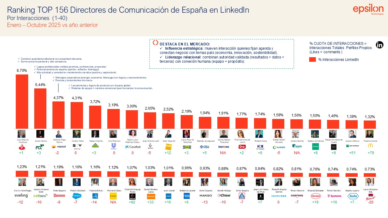 Juan Manuel Cendoya (Santander) lidera el ranking de dircoms más influyentes en LinkedIn en 2025, elaborado por Epsilon Technologies tras estudiar la actividad de 156 directivos de comunicación entre enero y octubre de este año. El análisis abarca perfiles de sectores como gran consumo, retail, IBEX35, banca, seguros, moda, automóvil y belleza.