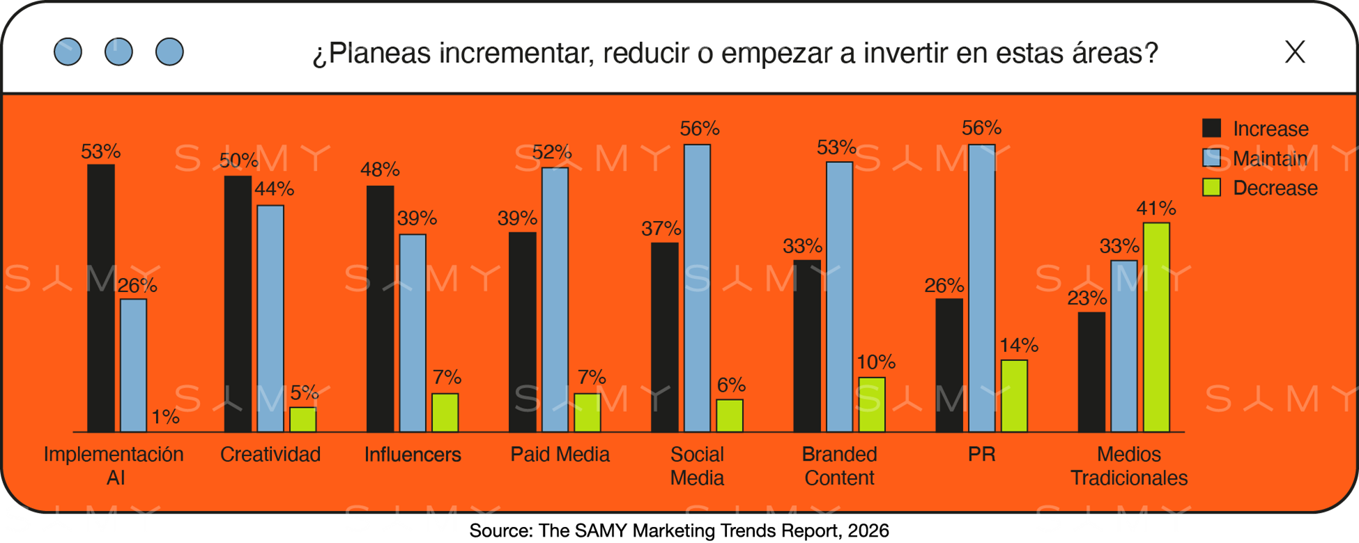 En cuanto al uso de la inteligencia artificial, más del 50% de los directores de marketing incrementará su inversión en esta herramienta y creatividad el próximo año. Samy destaca que la inteligencia cultural, apoyada por herramientas de inteligencia artificial, permitirá entender mejor las microseñales sociales y transformarlas en campañas significativas.