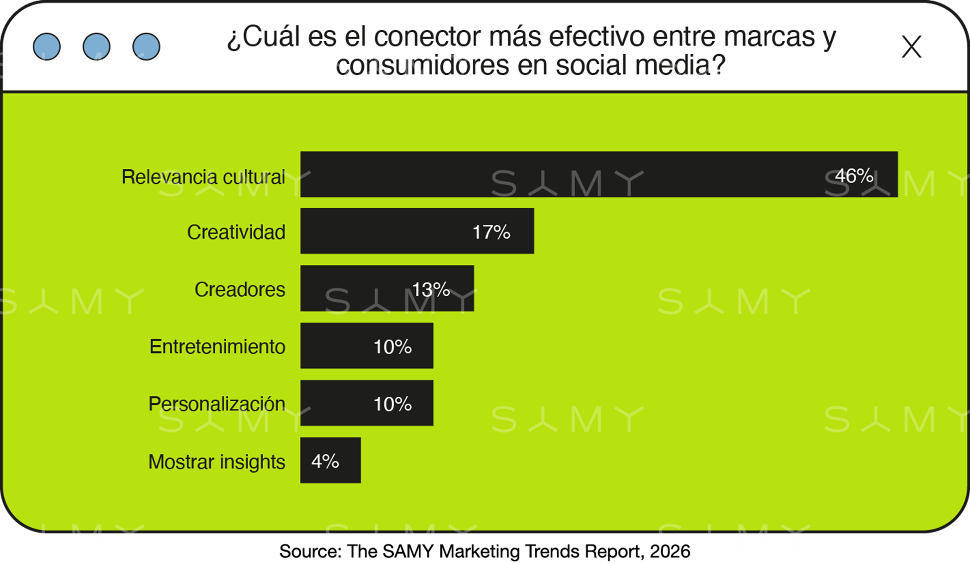 La relevancia cultural se posiciona como el nuevo ROI de la industria, según el estudio de la empresa Samy, agencia especializada en social media marketing. Elaborado a partir de encuestas a más de 100 directivos de marketing de empresas de 22 países como L’Oréal, Microsoft, Unilever o Visa, refleja un consenso sobre la necesidad de construir conexiones auténticas con las comunidades online.