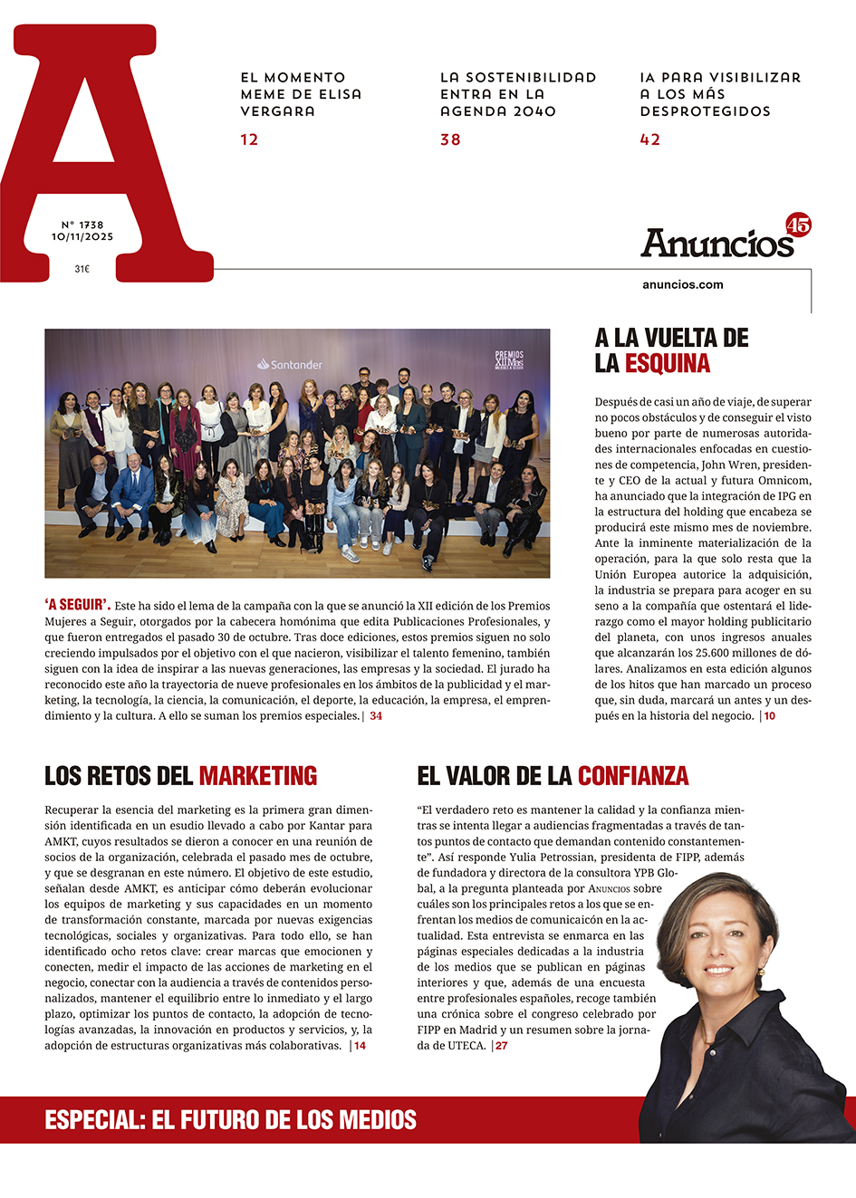 Además de una entrevista con Yulia Petrossian, presidenta de FIPP, organización que acaba de celebrar su centenario en Madrid en un evento del que publicamos una crónica, hemos realizado una encuesta entre profesionales de la industria de los medios para conocer sus retos y abordamos las principales conclusiones de una jornada organizada por UTECA. También en el Nº 1738 de Anuncios, entre otros contenidos: